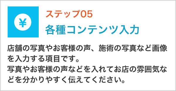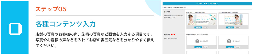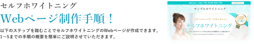 以下のステップを踏むことでセルフホワイトニングのWebページが作成できます。1〜5までの手順の概要を簡単にご説明させていただきます。